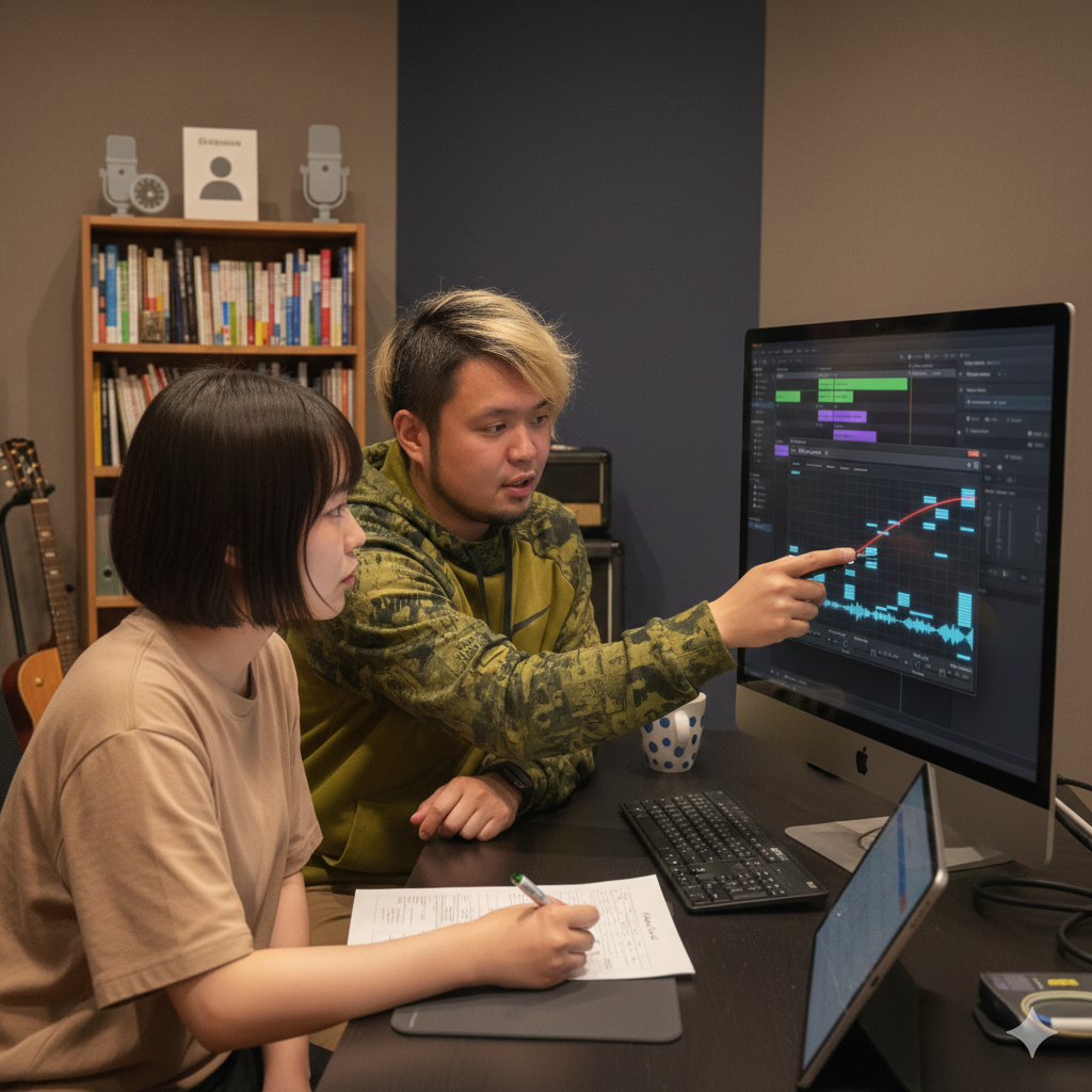 ピッチ解析や波形を用いて、音程やリズムを客観的・視覚的に確認します。